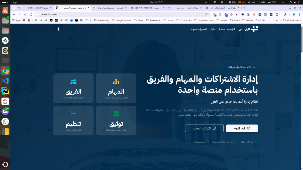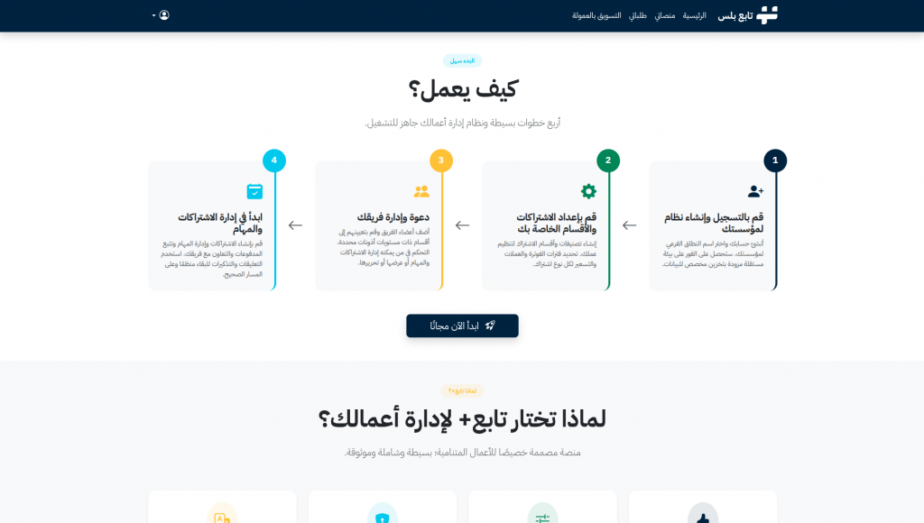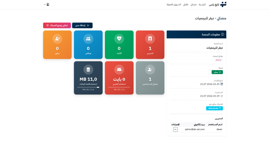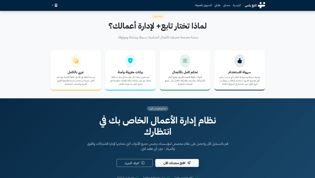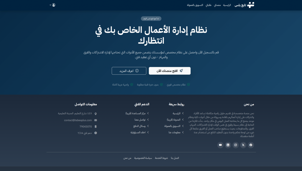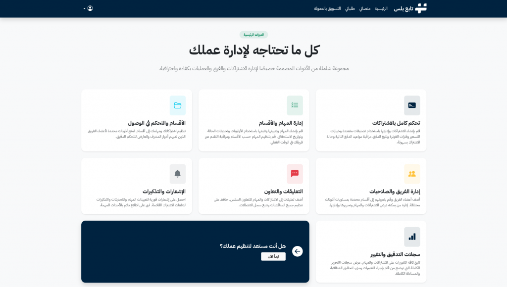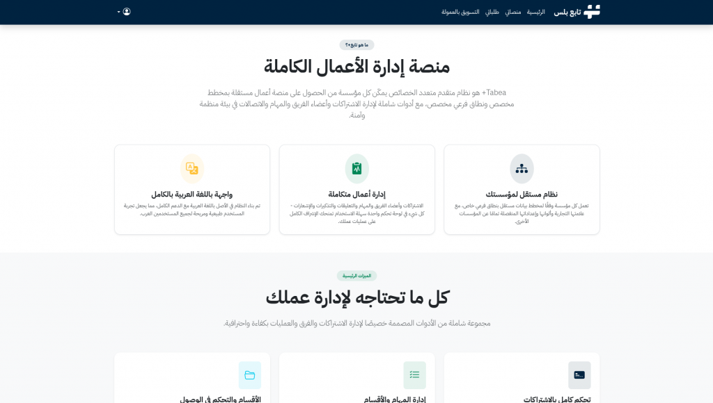 تابع بلس هو نظام SaaS متكامل يتيح لكل مؤسسة إنشاء منصتها الخاصة فور التسجيل، مع فصل كامل للبيانات والهوية البصرية. المنصة توفر بيئة مستقلة وآمنة لإدارة جميع جوانب العمل التشغيلي دون الحاجة لمهارات تقنية متقدمة.